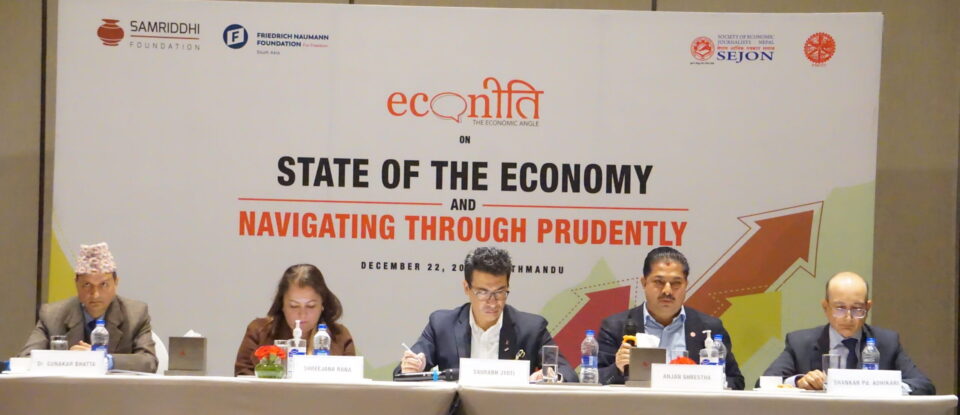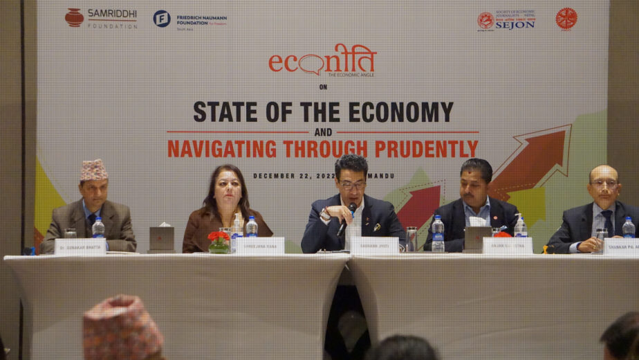 Samriddhi Foundation in association with Friedrich Naumann Foundation for Freedom South Asia (FNF) in collaboration with Society of Economic Journalists (SEJON) and Federation of Nepalese Chamber of Commerce and Industry (FNCCI) conducted a public-private dialogue titled, ‘State of the Economy and Navigating through Prudently’ on 22nd of December 2022 at Marriott Hotel Nagpokhari. The panel discussion was honored with the presence of esteemed dignitaries like Ms Shreejana Rana- President of Hotel Association of Nepal (HAN), Mr. Anjan Shrestha- Vice President (Commodity) of FNCCI, Dr. Gunakar Bhatta- Executive Director of Nepal Rastra Bank and Mr. Shankar Prasad Adhikari- former Secretary of Ministry of Finance. The session was moderated by Mr. Saurabh Jyoti- Director of Jyoti Group of Companies with the main agenda of discussing the present economic state of the country, its challenges and the way forward in overcoming those challenges and achieving development within twenty years.
